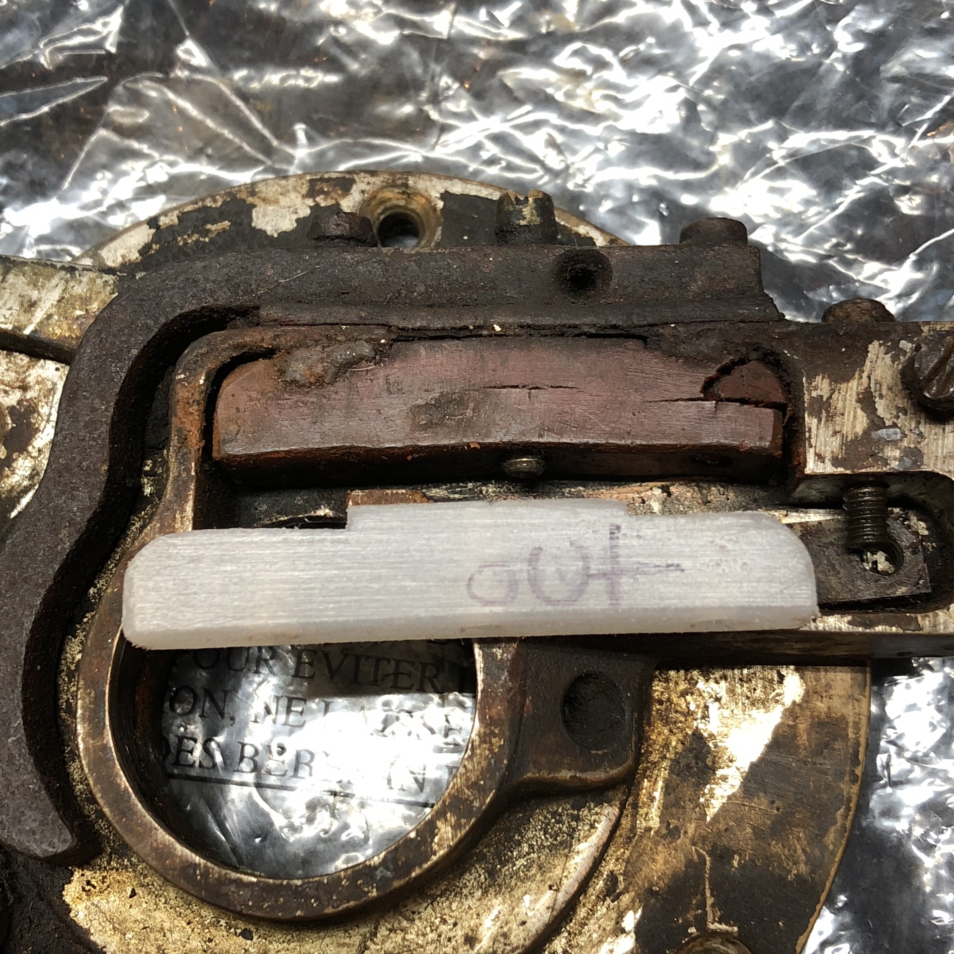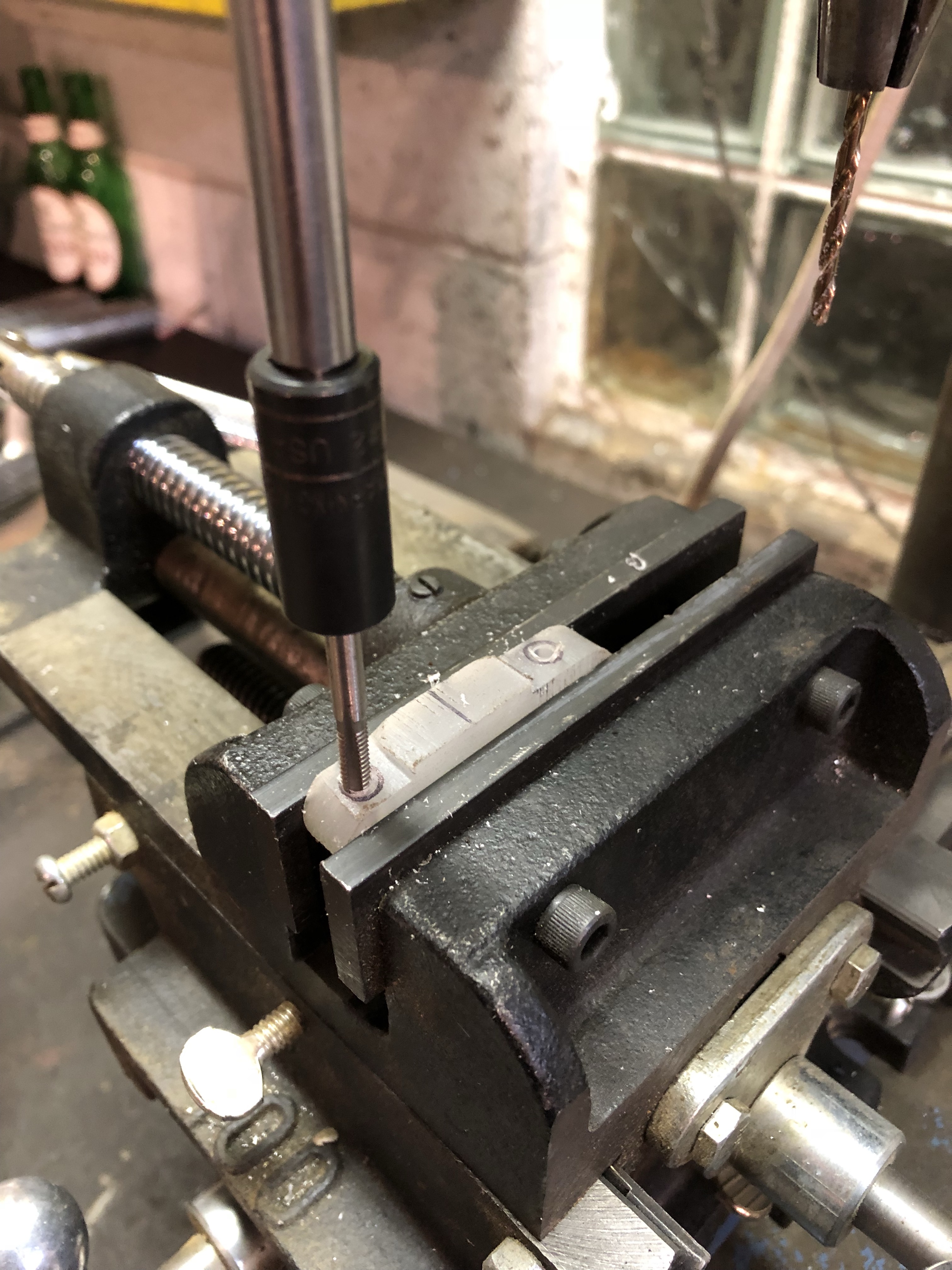 Next was to replace the Bakelite insulator that was stripped in the hold down screw holes. Here is the old one (red) and the new one (white).
