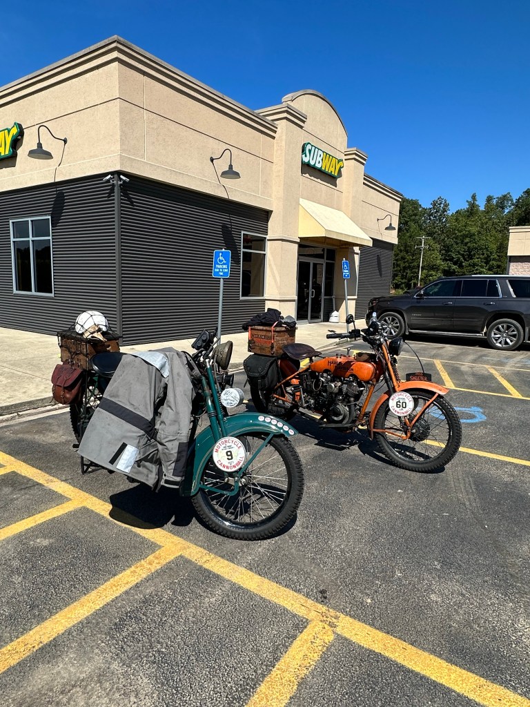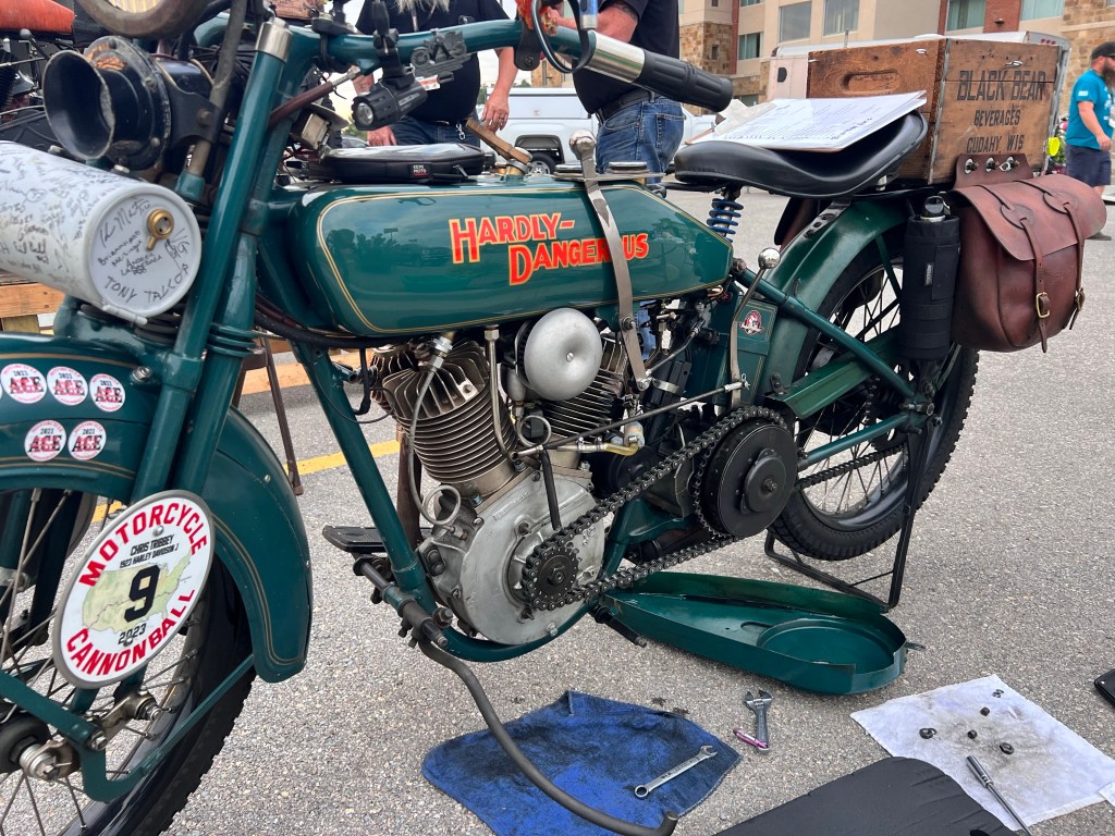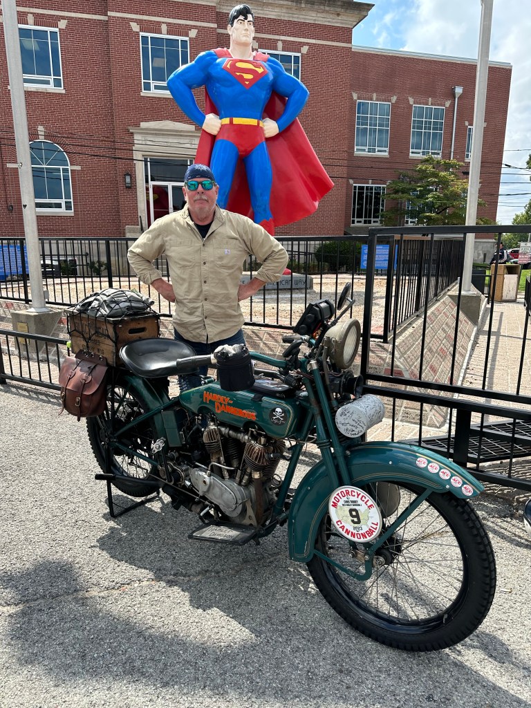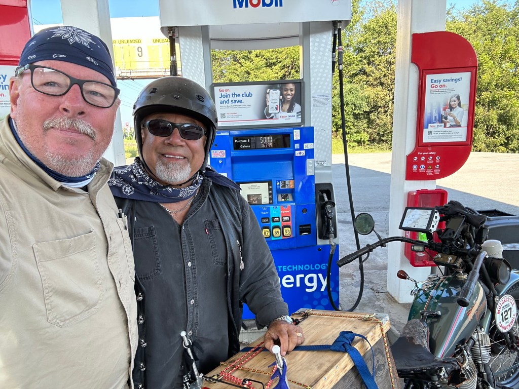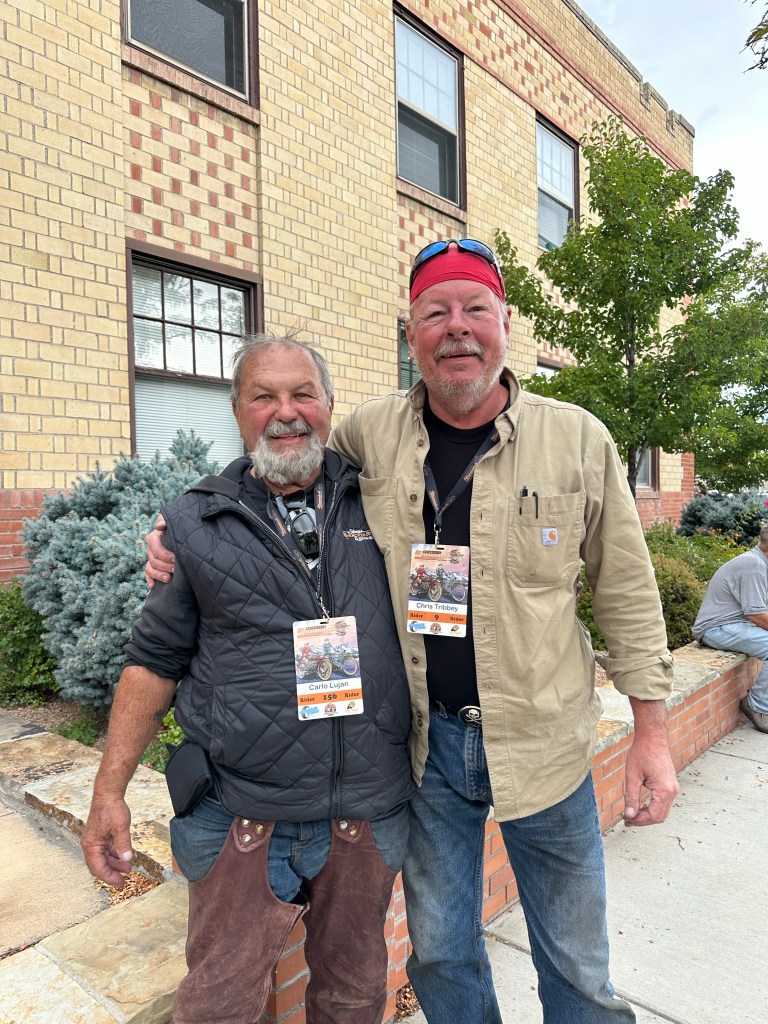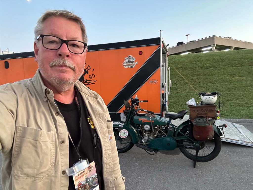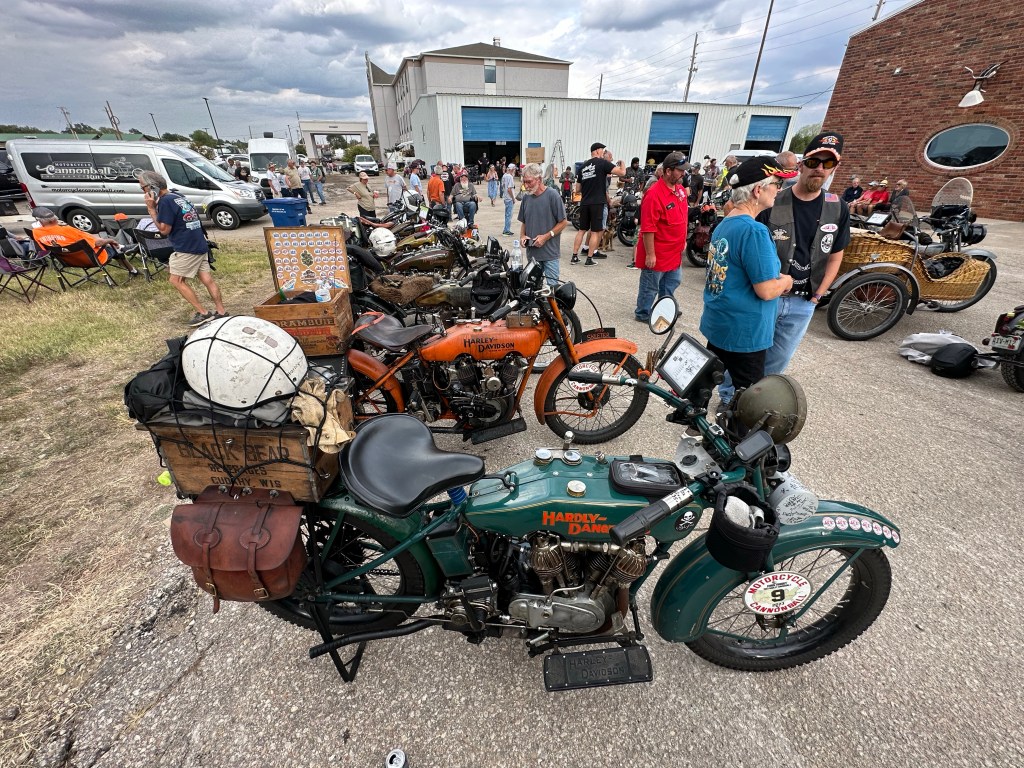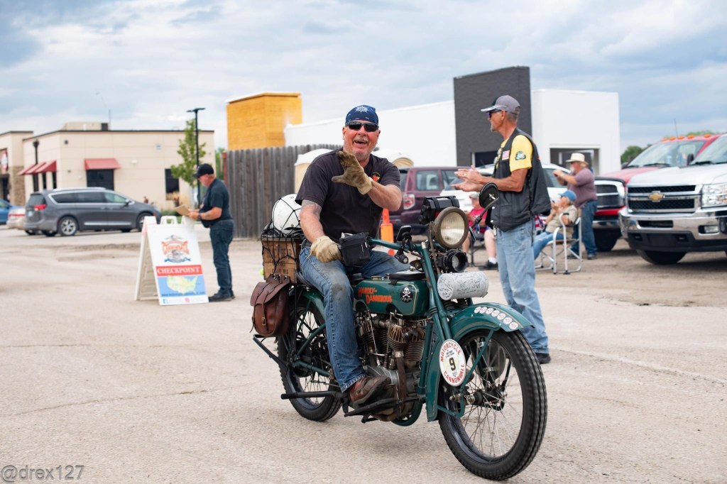 Good morning! Did not get breakfast at the hotel. I was rushed to fix a gas line leak! So the first gas stop I had a little breakfast. Here are two of the official photographers on the ride. They are really capturing some great video and images. Gives you an idea of where we were today. At the Twisted Oz museum for dinner. It was awesome to see Kelly. Much appreciated. Spotted the world famous Roger Green sporting the best USA made heavyweight pocket t-shirt. Grim Sweeper trailer. One of the bikes on the Grim Sweeper. Knowing this guy he will be back in the race tomorrow. With Dave. The overall winner of the 2021 Cannonball. He is riding a 1911 Harley with an atmospheric intake valve. Just like the 1911 Excelsior I rode in the 2018 Cannonball. Got “all the miles”! 280 today. Team BOT (Bartman, Olson, and Tribbey) all finished again today.