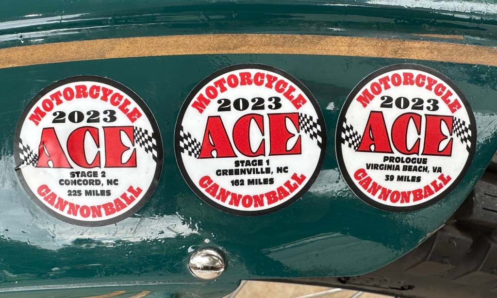 What I did all day. All the ACE stickers so far. Stopped for lunch at TR Restorations and they had a taillight lens. Jason Sims (Director of Operations of the Cannonball), Terry Richards (owner of TR Restorations, and fellow rider Cole Deister. Terry hosted lunch at his shop. TR Restorations. Bartman had a close call today. Got away with just a warning. The three of us made all the miles again today. Tribbey, Olson, and Bartman.