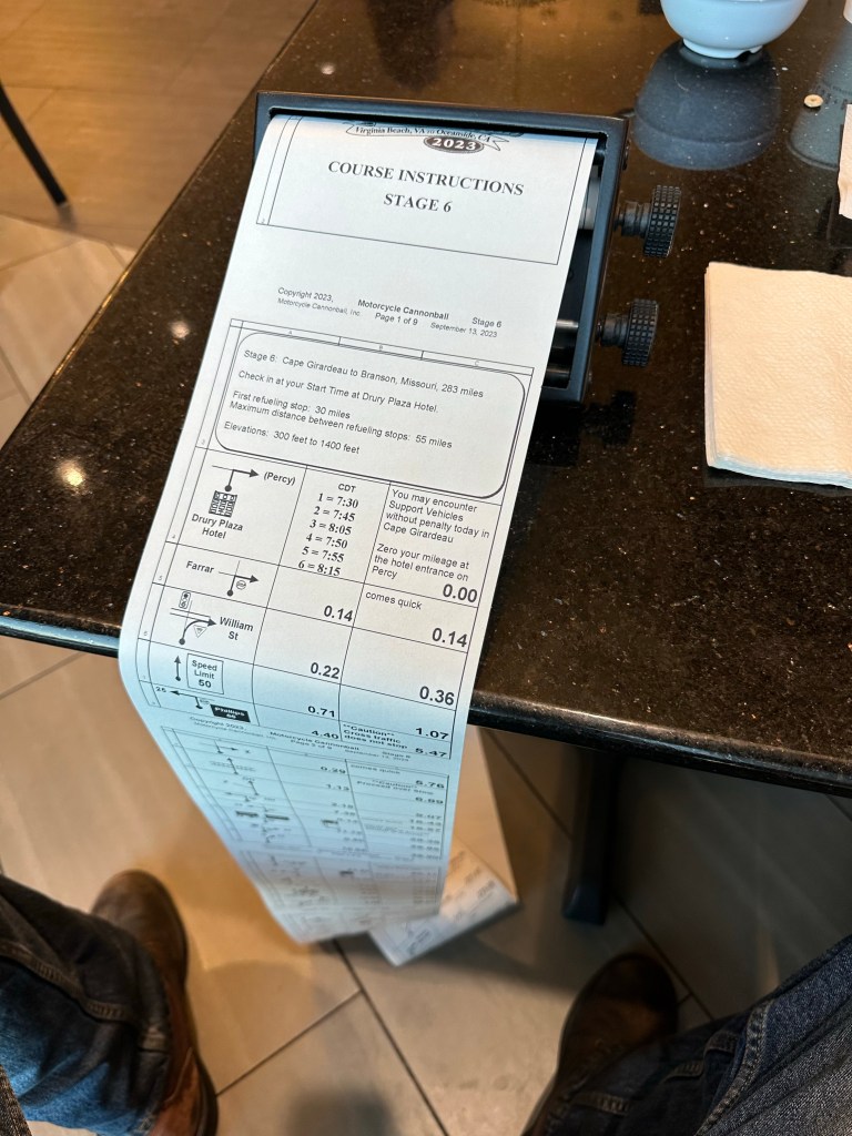From yesterday. 7 hours in the saddle. Geared up at the start line yesterday. Pulling in across the finish line last night. Made the Wall of Fame last night! LOLThe day starts with rolling up the route sheet. Lost my taillight glass lens after hitting a huge pothole. Have another one on the way. A perfect lunch today. At lunch we are at 1269 miles since we left VA Beach. 2533 to go.Made all the miles with my two riding partners Pat Olson and John Bartman. You DO NOT want to be on the sweep trailer. Each time I change oil during the day I make a note. All day this is what I see. Pulling in the Cape last night. Last nights daily routine. Complete maintenance each night. Todays ride. After Stage 6 I’m still in 9th place.