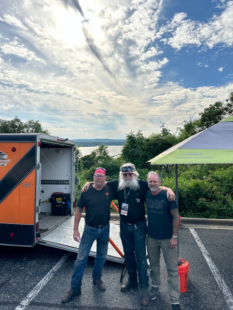 Morning shot before leaving. Tony came to welcome me in at Clarksville With Danny along the way. With Micah along the way. When I arrived at the end. With Ugly brothers Micah and SteveOne of my shirts Ed was wearing. That’s George facing the camera. A true JD guru. Front fender stickers from each day. Class One bikes leaving this morning.