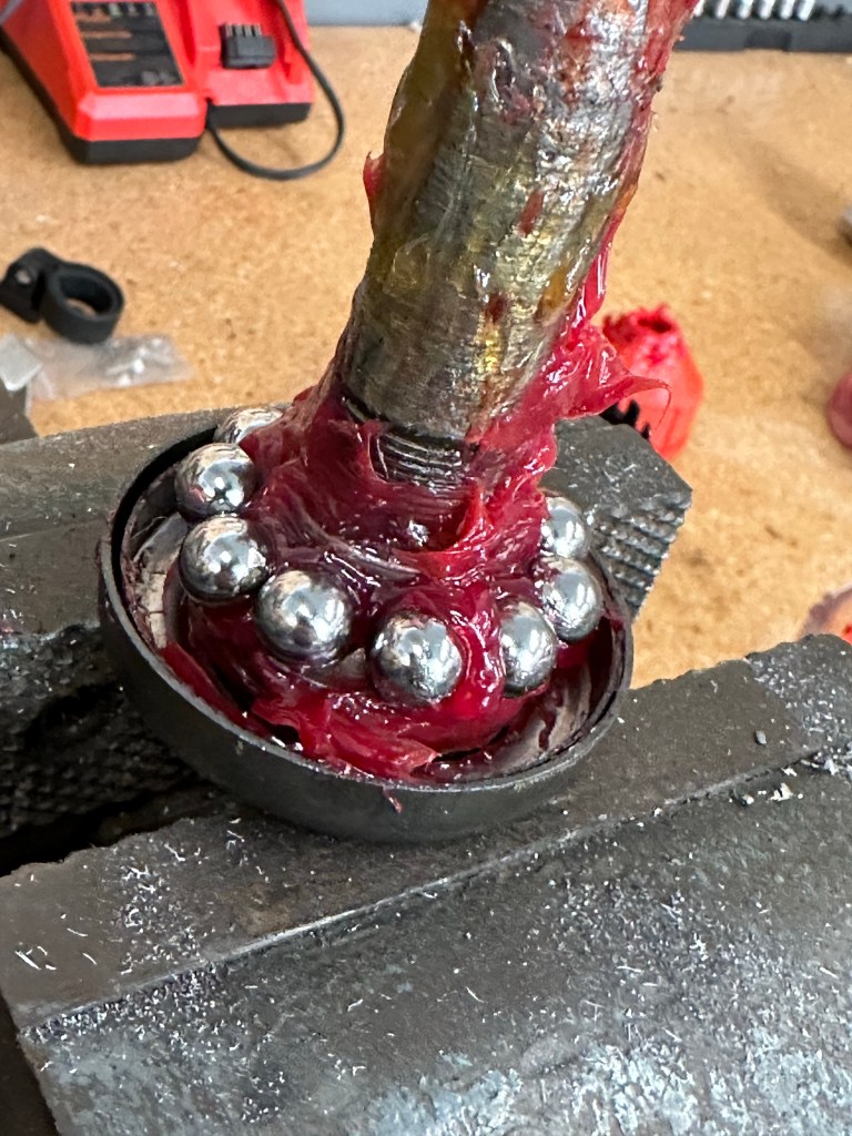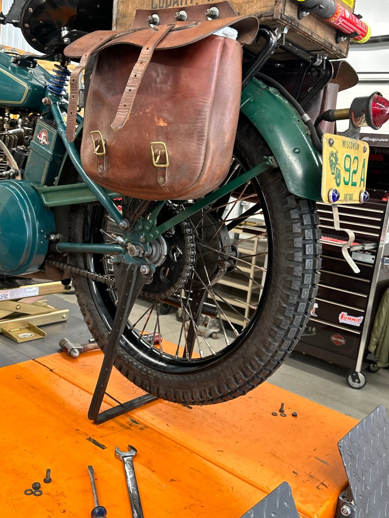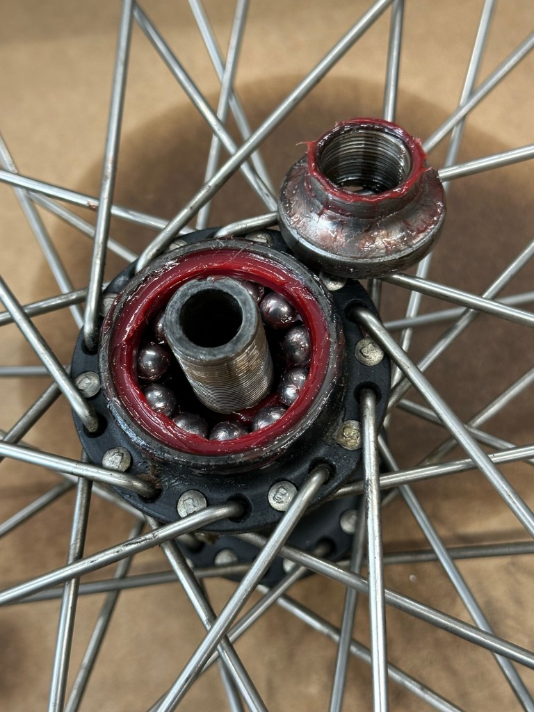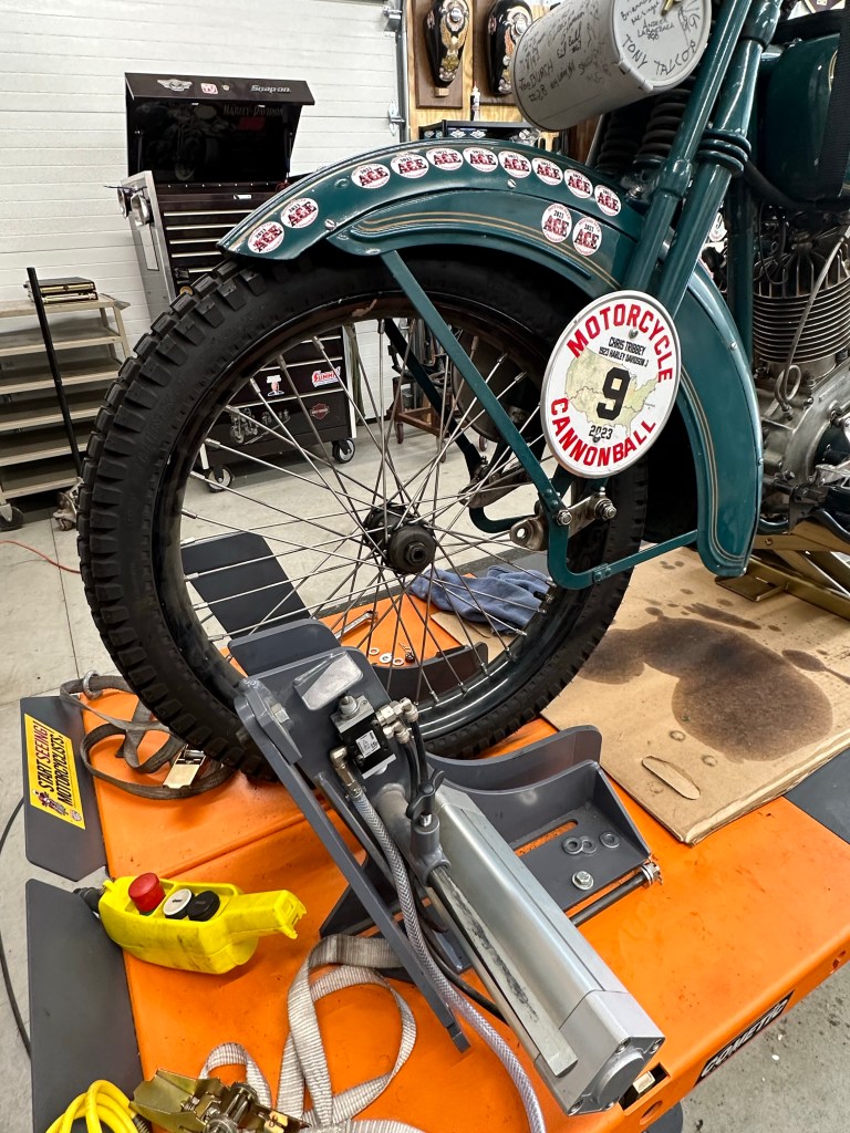 Rear wheel back on after new tire and brake service. Sometimes you need to fabricate a special tool. I needed a thin 1-1/4” wrench to tighten the brake anchor plate. Not pretty but got the job done. Next is to remove the front wheel for spike tightness check and bearing repack. Looking good. I installed new ball bearings and plenty of grease. Snugged up the neck bearings a bit also. Back together! Time to ride. A nice 24 mile ride. All great! Nightly charging of the accessories.