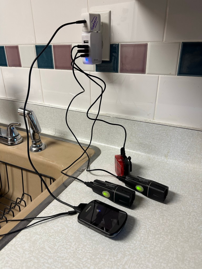 Last gas stop and oil change. Got “all the miles”. A good day. So the nightly work begins. Still working as the sun sets. I have no crew. Still at it. Charging up my lights and speedo. Riding in tonight.