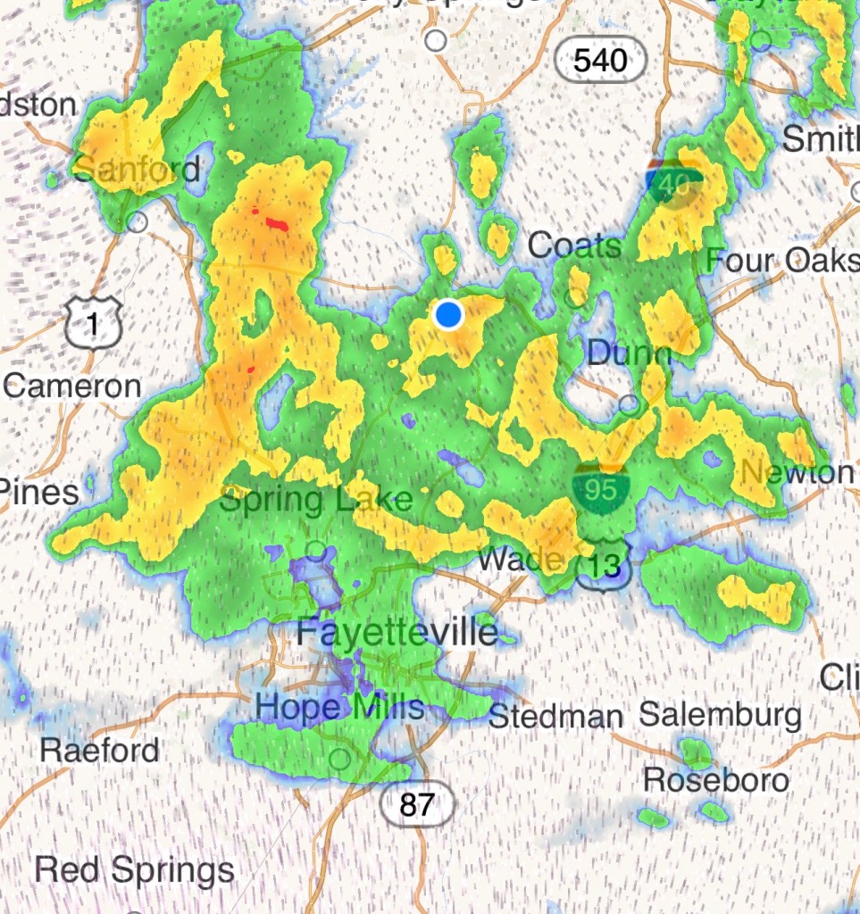 6 am this morning. Getting prepped. We are the blue dot. A torrential rain. NOT FUN!