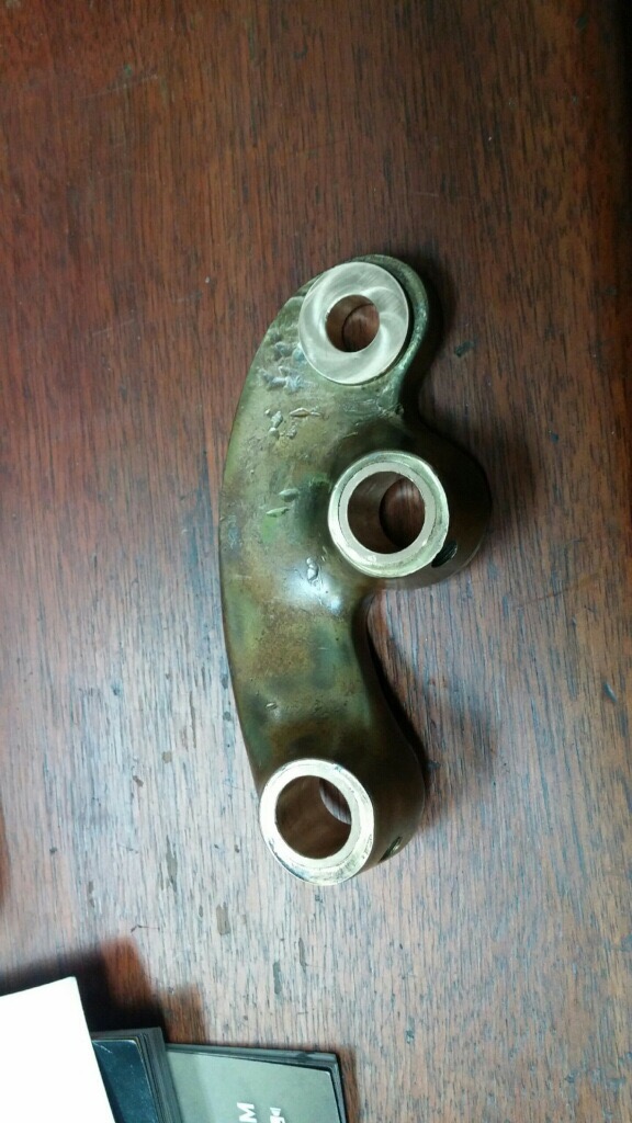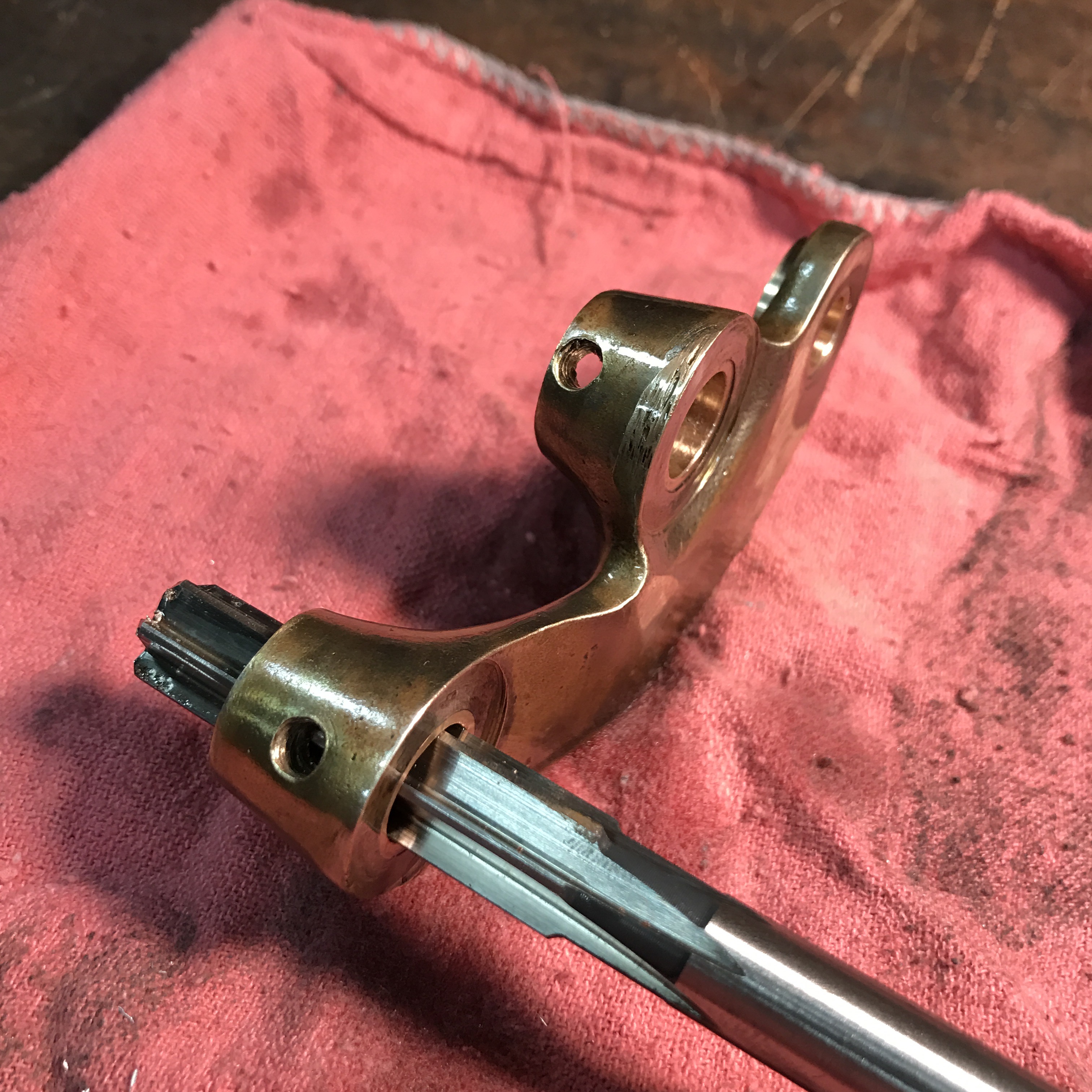 Here is a shot of one lower rocker during repair. All three holes were egg shaped after all these years. These are made of brass. The process to repair was to bore the holes larger and press in, then bore new holes to size. Still to be done to these is drill the oil hole and groove the bushings for grease retention.