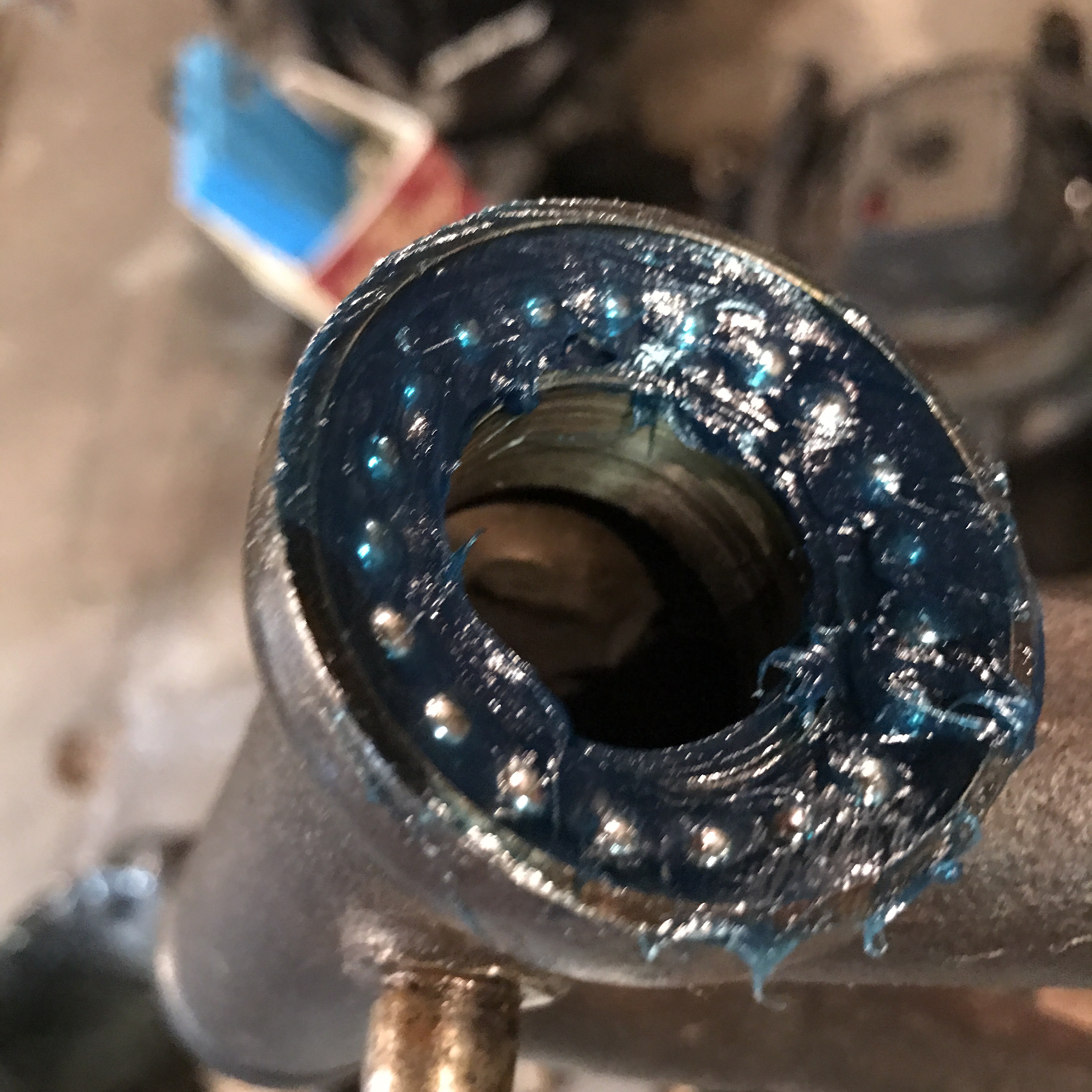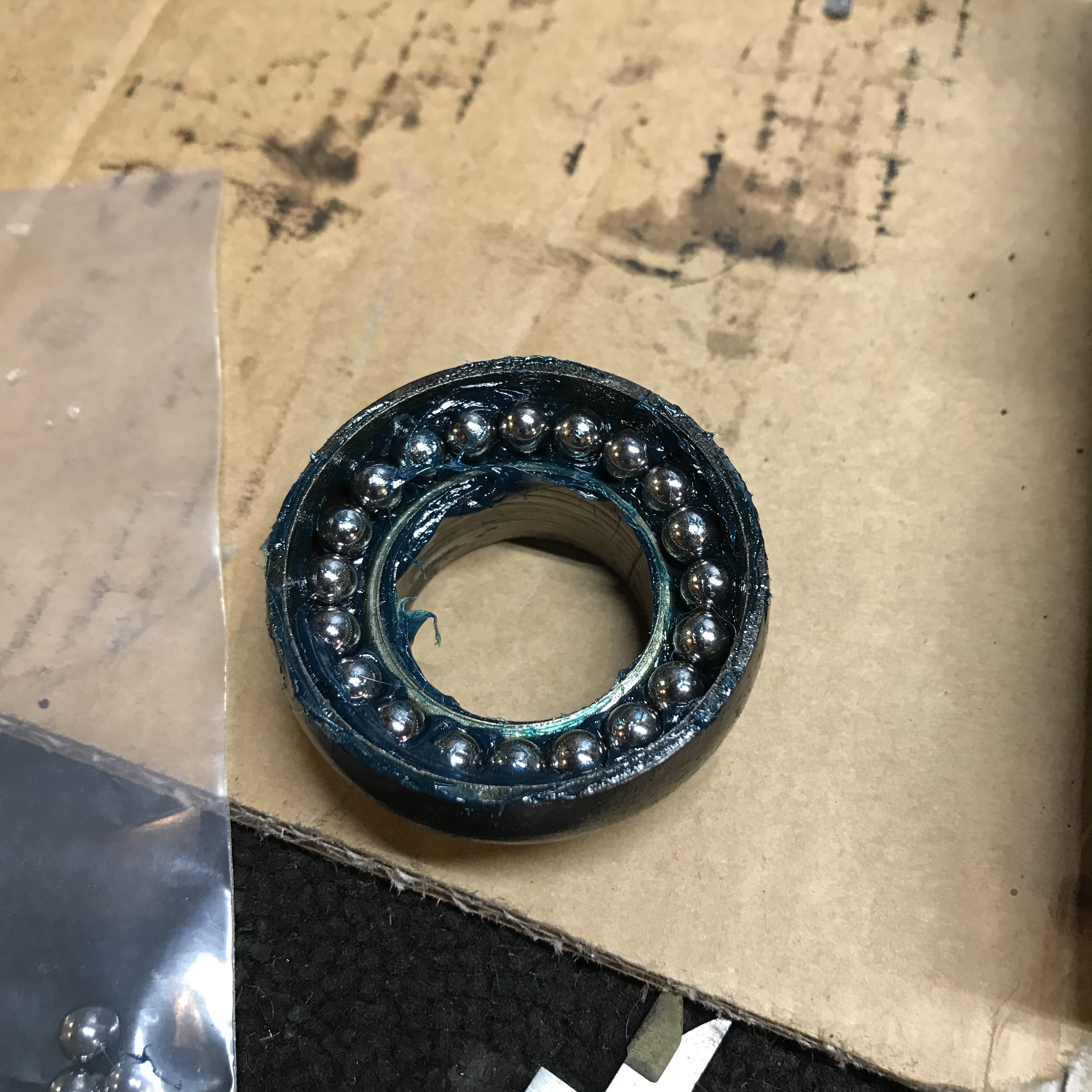 Now that the fork repair has been made assembly can begin on the front fork. New ball bearings and fresh grease, and slide through the frame neck. This is a major step forward! Next will be to install the lower rockers, front fork, and wheel assembly. Slow and steady progress.
